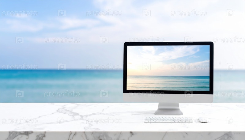 Гладкий рабочий стол на мраморном столе с океаническим фоном, символизирующим удаленную работу, цифровой образ жизни и спокойную производительность