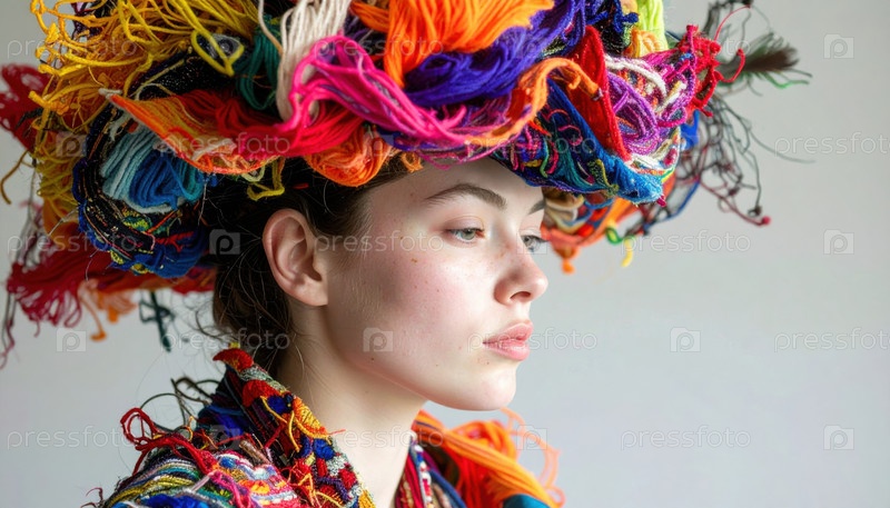 Молодая женщина, одетая в художественный и красочный костюм из запутанной пряжи и текстиля, сделанного из нитей, сложный головной убор