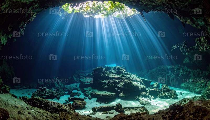 Пещера с солнечным светом, через отверстие освещающие подводные скалы и голубую воду