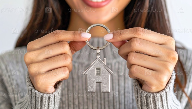 Улыбающаяся женщина, держащая ключик от дома, представляет темы собственности на дом, инвестиций в недвижимость, успеха и эмоциональной связи с жильем