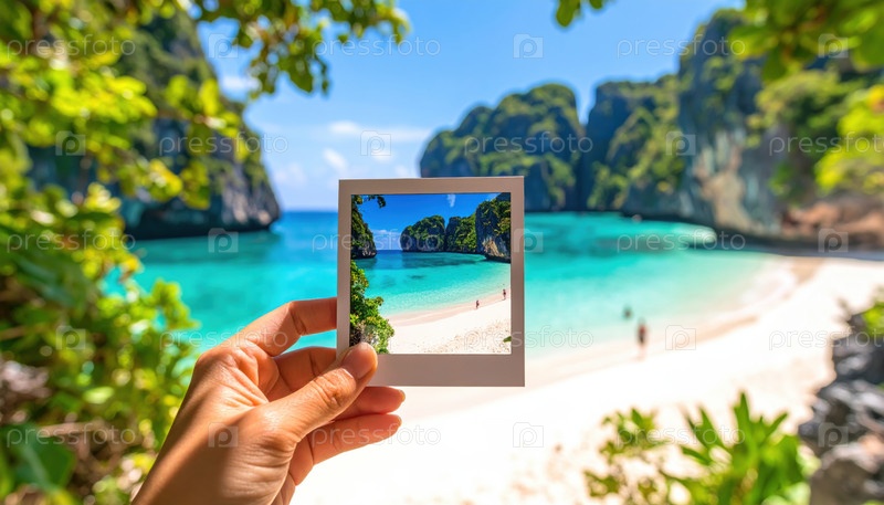 Тропическая пляжная сцена, обрамленная фотографией, захватывающей ностальгию летних каникул, идеально подходит для приложений рекламы путешествий или контента в социальных сетях