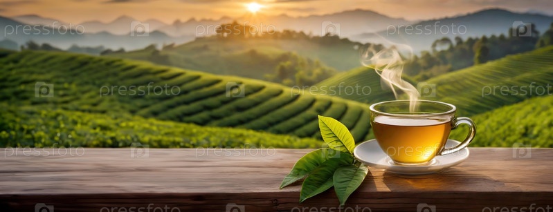 Поднимающаяся чашка чая с зелеными листьями на деревянной поверхности и живописная чайная плантация на рассвете. Панорама с копировальным помещением. Баннер
