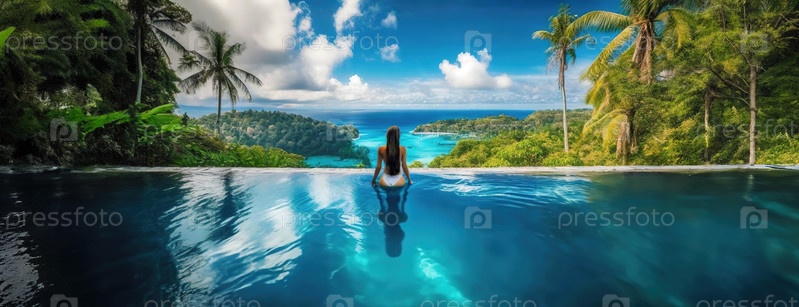 Кристально чистые воды бассейна с бесконечностью плавно смешиваются с лазурным океаническим горизонтом.Женщина на летних каникулах, тропический остров