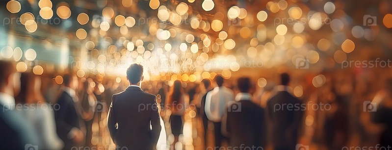 Мужчина в костюме выходит на сцену, заполненную боке с теплым освещением, предлагая официальную встречу или мероприятие