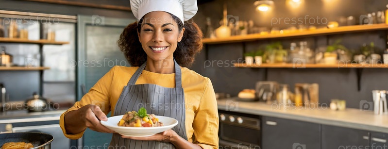 Улыбающаяся женщина смешанной расы представляет салат, иллюстрирующий кулинарные способности и страсть