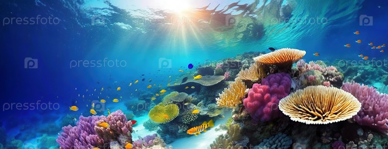 Подводная безмятежность встречает яркую жизнь кораллового рифа. Разделенный вид на подводную сцену, показывающую красоту тропической водной жизни. Большой барьерный риф в Австралии