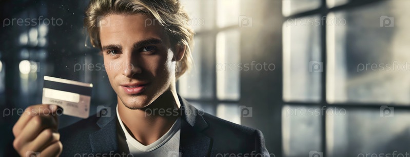 Красивый молодой человек представляет кредитную карту с уверенной улыбкой