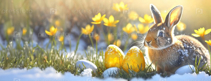Пасхальный кролик в солнечном саду с украшенными золотыми яйцами и желтыми цветами на последнем тающем снежном фоне