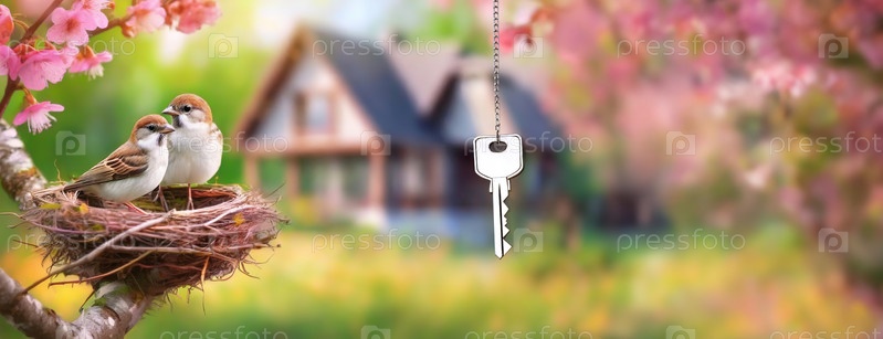 Воробьи в гнезде с вишневыми цветами и ключом от дома, а на расстоянии размытый дом