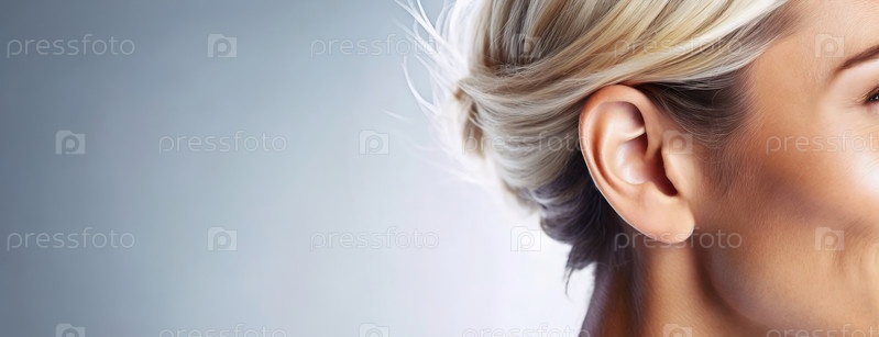 Женщина с современным слуховым аппаратом в ухе на светлом фоне. дискретный слуховой аппарат в ухе, ее блондинки и чистый фон подчеркивают устройство