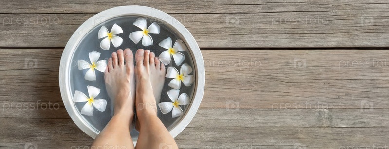 Ноги замоченные в миске с цветами плюмерии, ритуал самообслуживания. Спокойный спа-салон с деревянным фоном, который улучшает атмосферу расслабления. Панорама с копировальным пространством, пустой фон