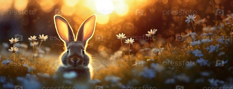 Кролик смотрит из пышной зеленой травы. Заяц с большими ушами, заложенный в естественном укрытии. Пасхальный кролик. Панорама с копировальным пространством