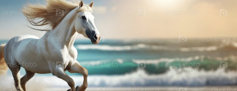 Белый конь галопирует вдоль берега моря с волнами на заднем плане.Панорама с копировальным пространством