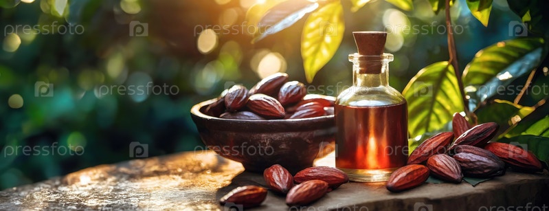 Миндальные орехи и масло в маленькой бутылке, окруженные зеленью на открытом воздухе