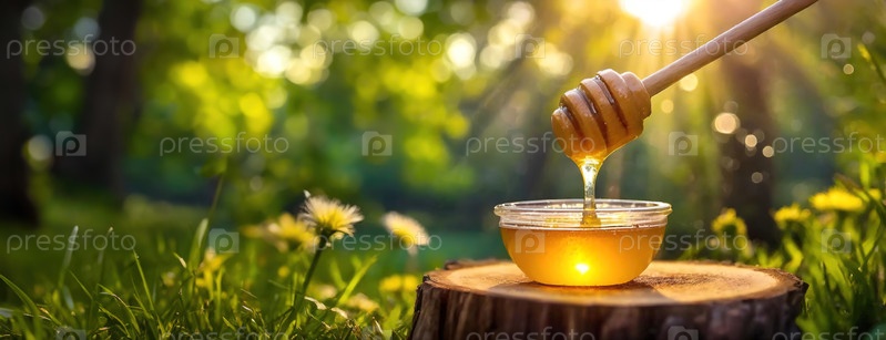 Медовый нектар светит в солнечном весеннем зеленом лесу. Золотой сахарный сироп течет на фоне зелёных лесов. Панорама с копировальным пространством