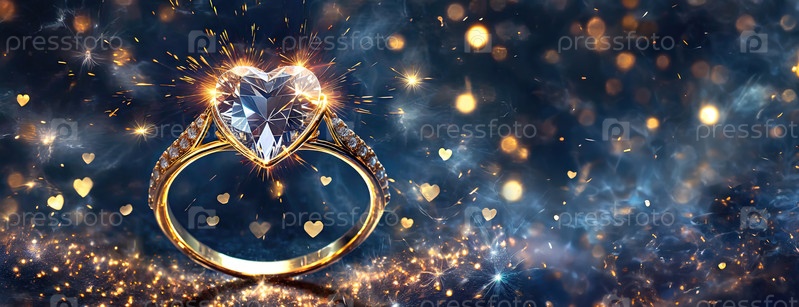 Обручальное кольцо с искрами в форме сердца иллюстрирует романтику. блестящая жемчужина представляет вечную любовь на небесном фоне. панорама со копировальным пространством