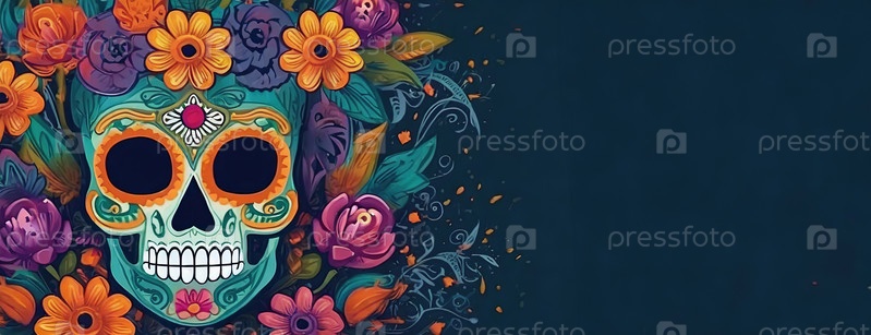 Яркая иллюстрация мексиканского фестиваля 'День мертвых' с красочными цветами, декоративными узорами и стилизованным сахарным черепом на темном фоне