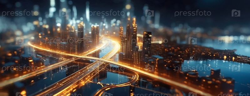 Ночная сцена футуристического города с освещенными автомагистралями и перекрестками, демонстрирующими яркие огни и развитую инфраструктуру городского ландшафта