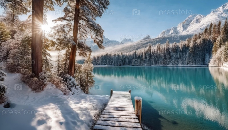 Тихий зимний восход солнца над снежным озером, окруженным соснами, захватывает спокойствие природы в холодный сезон