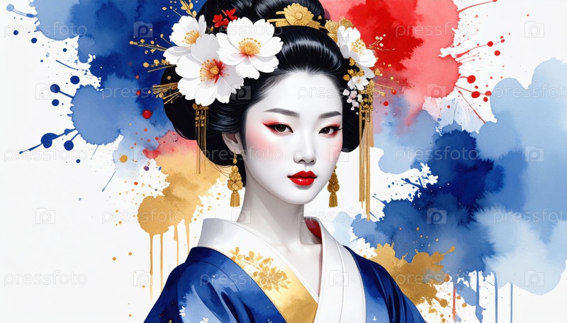 Стилизованный портрет женщины в традиционном японском костюме из цветов вишни, сочетающий культурную элегантность и современное искусство для темы идентичности и самовыражения, акварельная живопись