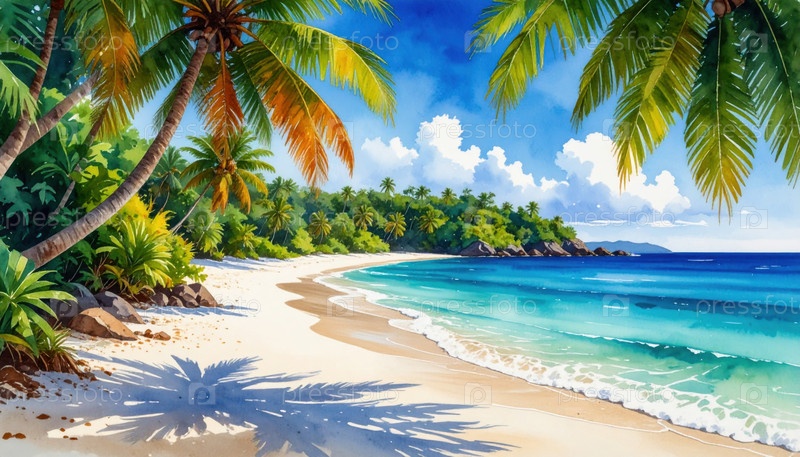 Тропическая пляжная сцена с бирюзовыми водами и пальмами, передающие летние каникулы, экзотические развлечения и нетронутую природную красоту для концепций путешествий