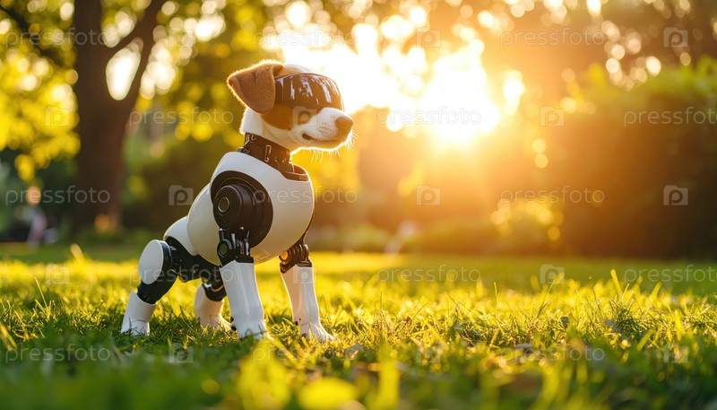 Футуристическая робот-собака сочетает технологии и природу в солнечной парковой среде, символизируя сосуществование спутников ИИ с внешним образом жизни и тенденциями домашних питомцев