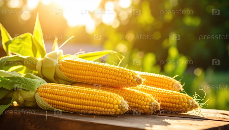 Свежая кукуруза на деревянном столе под солнечным светом символизирует летний урожай, органическое сельское хозяйство и образ жизни от фермы до стола
