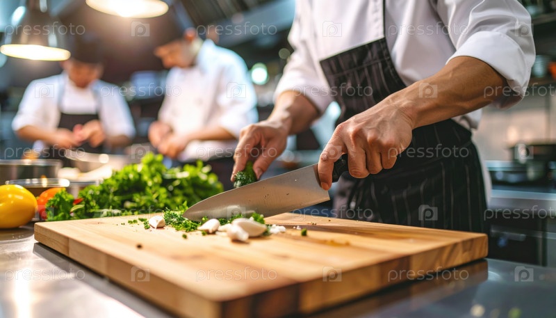 Шеф-повар нарезает травы на оживленной кухне ресторана, внедряя кулинарные навыки, командную работу и быструю профессиональную среду приготовления пищи