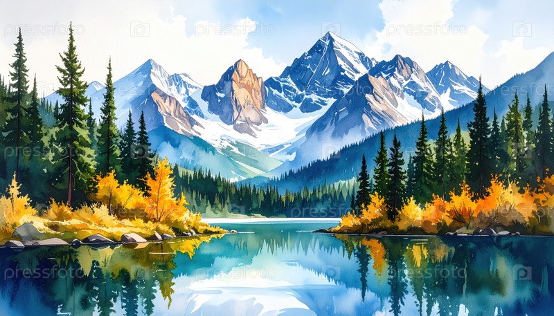 Красочный горный пейзаж с озером осенью запечатлен в стиле акварели, символизируя красоту природы, спокойствие и сезонную трансформацию