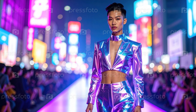 Футуристическая модель на неоновой подиуме сочетает в себе научно-фантастическую эстетику с смелыми тенденциями уличной одежды и авангардным выражением
