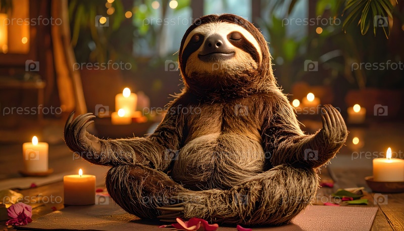 Медитирующий ленивец в комнате под свечами в джунглях представляет собой внутренний покой, медленную жизнь и осознанность в странной обстановке уединения в лесу