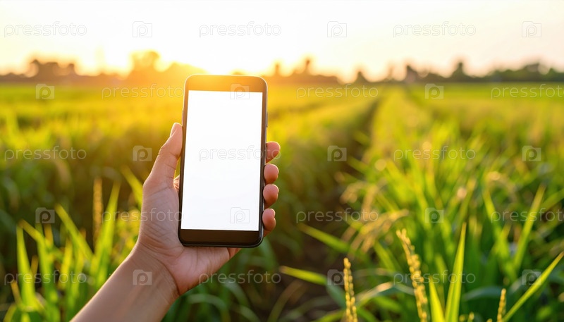 Руки держат смартфон в поле зеленого земледелия на закате, подчеркивая роль умного сельского хозяйства и цифровых инноваций в современном сельском хозяйстве