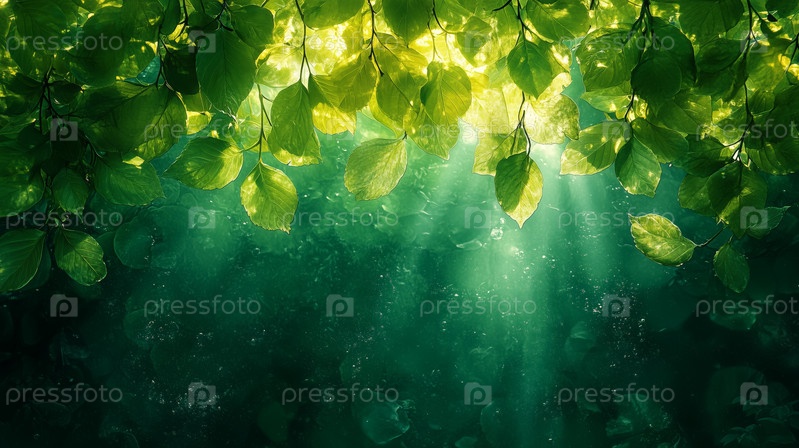 Солнечно-зеленые листья с яркими лучами света и эффектом боке