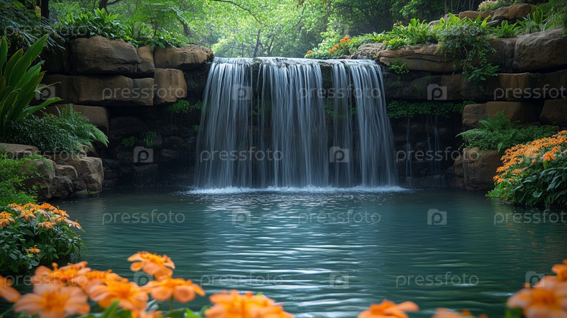 Небольшой каскадный водопад в пышном саду с ярко-оранжевыми цветами