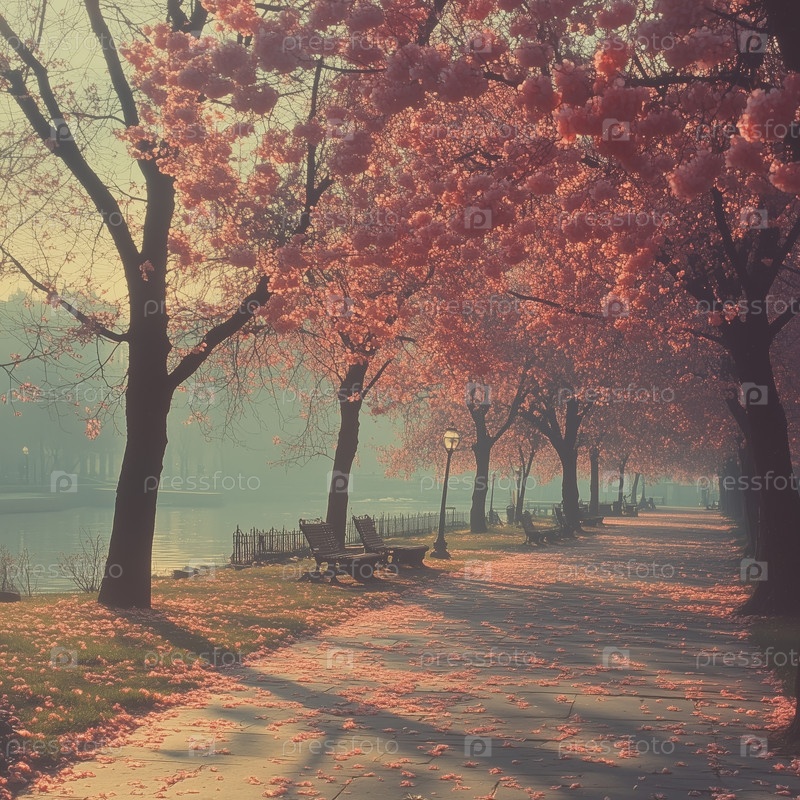 Как вишневые цветы вдоль реки в мягком утреннем свете