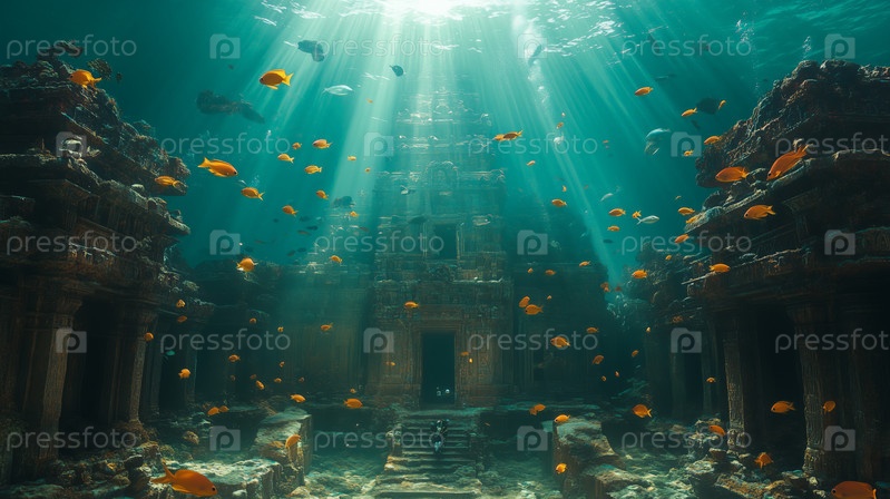 Дайвер приближается к древним руинам храмов глубоко под водой