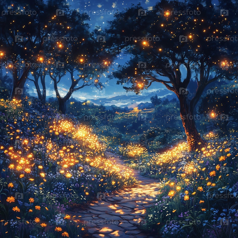 Волшебная ночная тропа через светящийся цветочный луг с светлячками