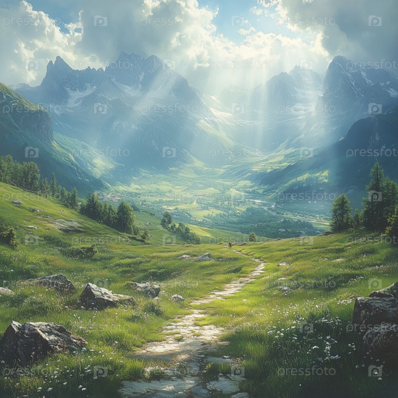 Горная долина с солнечным светом и извилистой каменной тропой