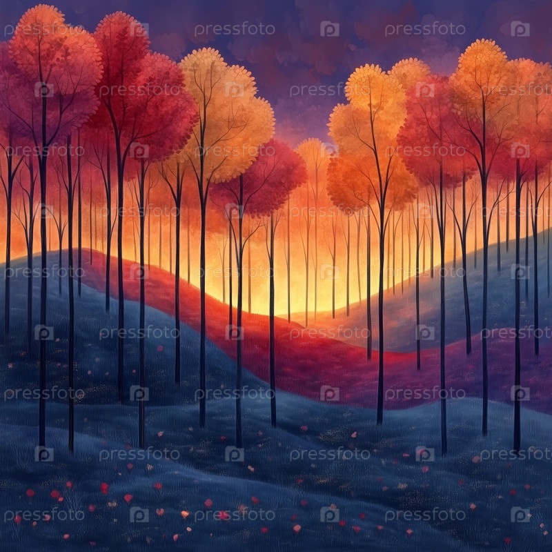 Сюрреалистический осенний лес с красочными деревьями и сияющими холмами заката