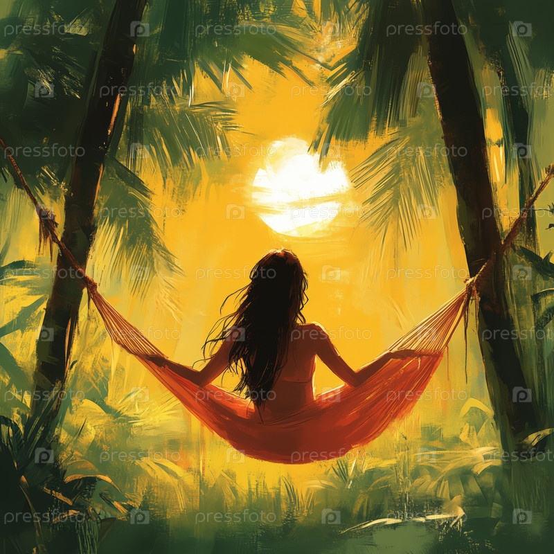 Женщина отдыхает в гамаке при закате солнца в тропических джунглях