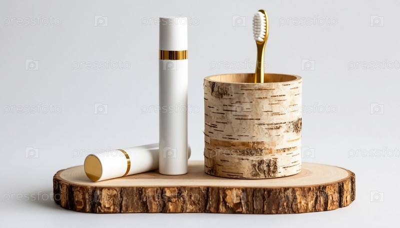 Белая трубка и золотая зубная щётка в березовой коре на белом столе