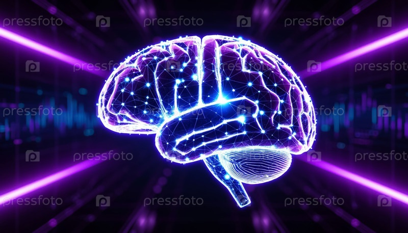 Человеческий мозг состоит из светящихся блокчейн-узлов на темном фоне