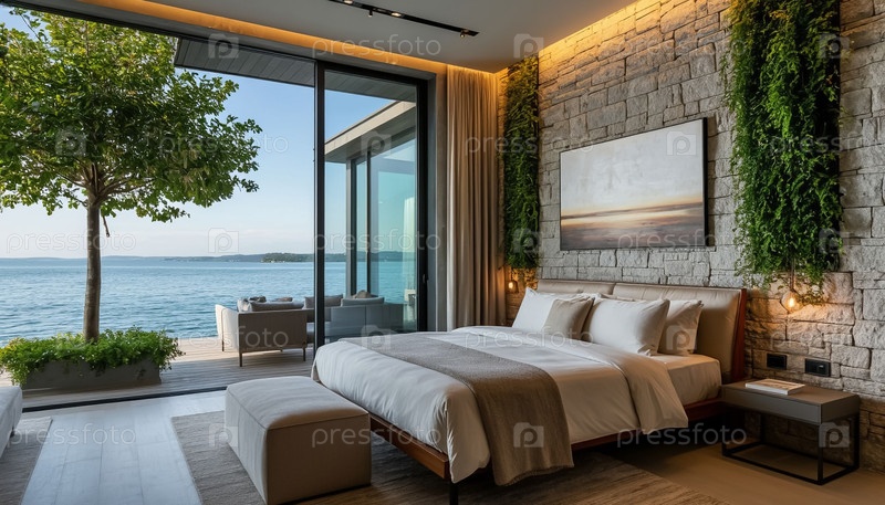 Роскошный дом у моря - спальня и терраса с выходом на воду. загородный отель. генерация ИИ