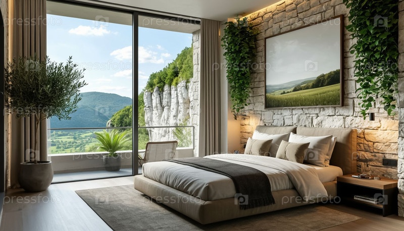 Роскошная гостиничная спальня в горах, панорамное окно