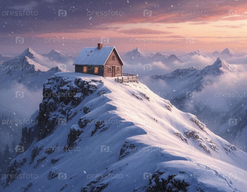 Одинокий дом на вершине снежной горы