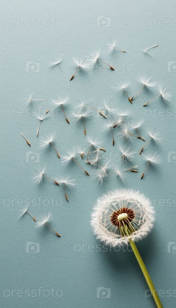 Лампочка пушистая сбрасывает семена, синий фон, пространство для копировки