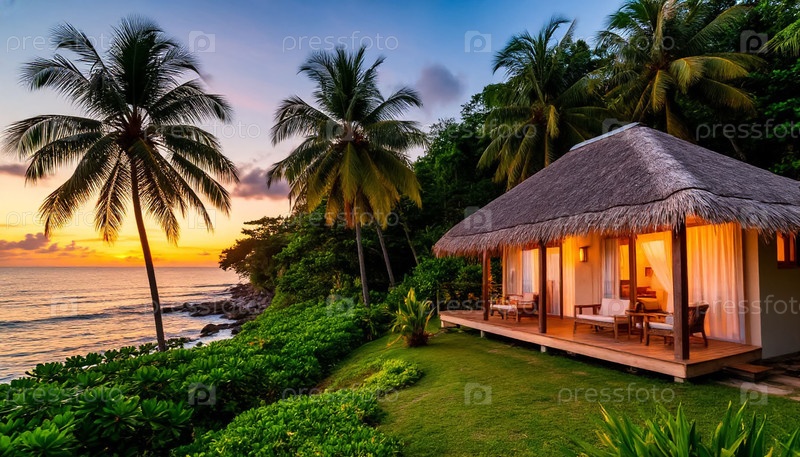Сламчатый бунгало на крыше promenade при закате солнца