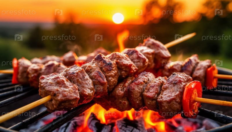 Закрытие барбекю на закате в поле, летний пейзаж