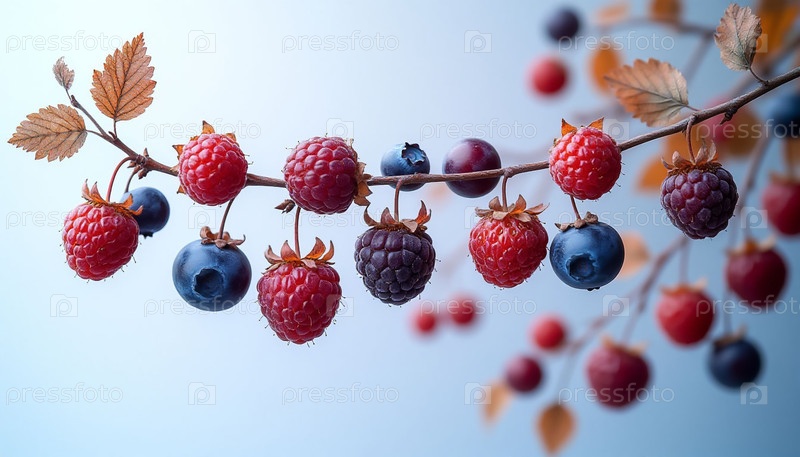 Лесные ягоды отличаются на одной ветке на синем фоне, созданной AI