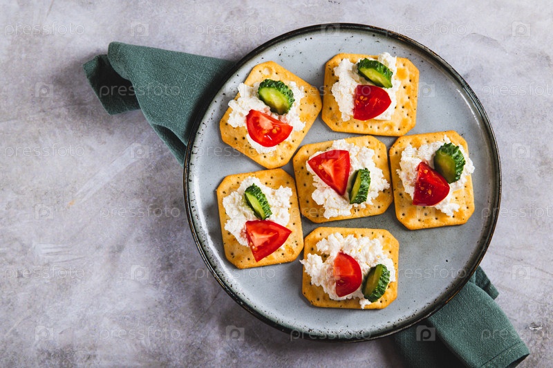 Закройте крекерные закуски с рикотой, огурцом и помидорами на верхний вид тарелки